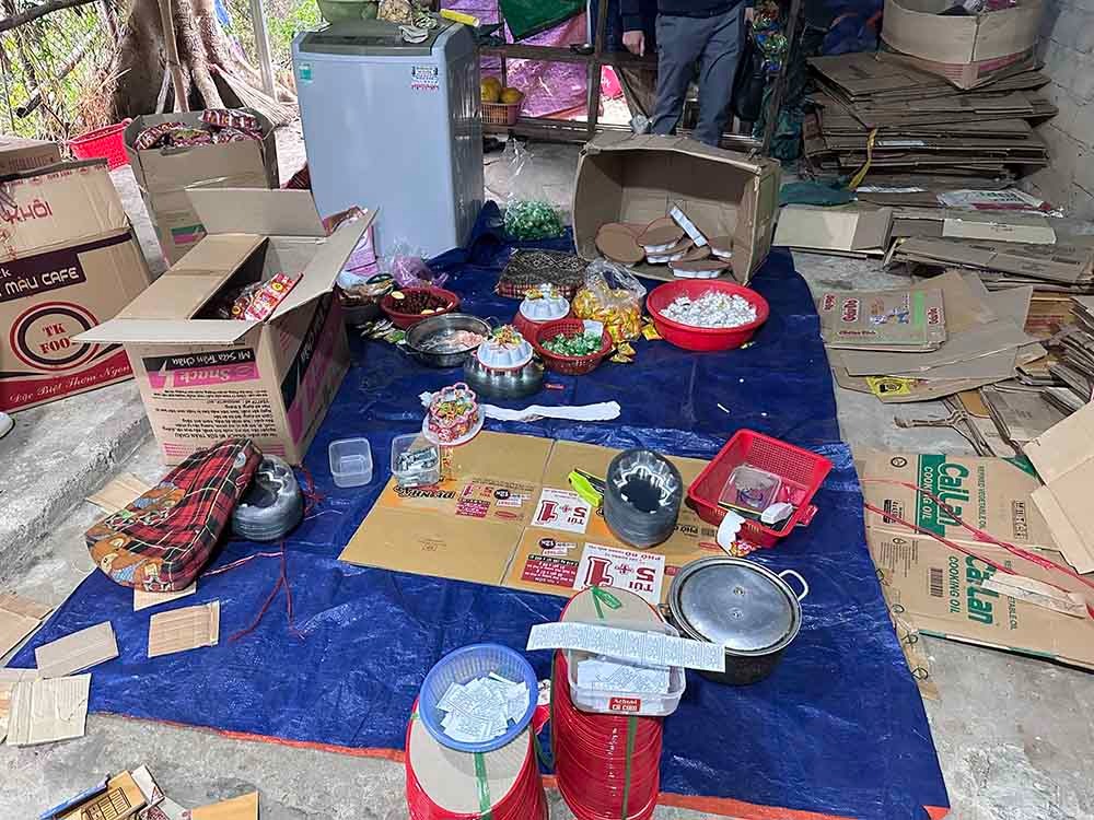 Gần 1.000 hộp mứt Tết giả thành phẩm cùng nhiều gói mứt chưa đóng gói không rõ nguồn gốc sản xuất bị phát hiện, thu giữ tại Vĩnh Phúc, ngày 11/1/2024.