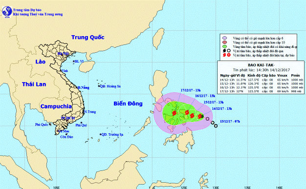 Áp thấp nhiệt đới ở vùng biển phía đông miền Trung Philippines đã mạnh lên thành bão với sức gió giật cấp 10, có tên quốc tế là Kai-tak.