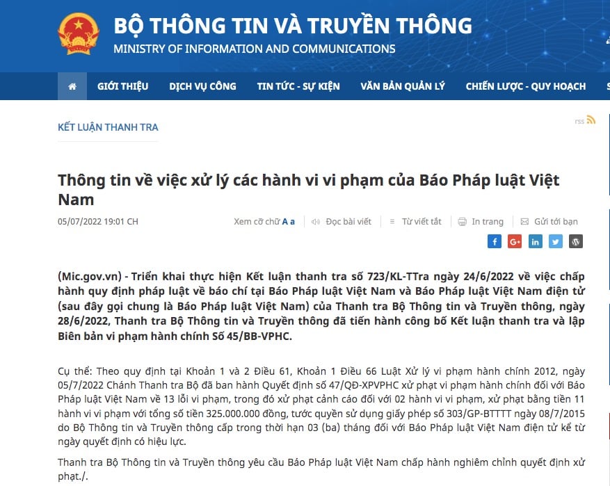 Thanh tra Bộ TT&TT đã quyết định xử phạt báo Pháp Luật Việt Nam đối với 13 hành vi vi phạm, đình bản báo Pháp Luật Việt Nam điện tử 3 tháng.