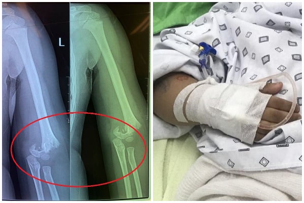 Bé N.B.P. (5 tuổi) bị gãy tay trong giờ học tại Trường Mầm non Vườn trẻ thơ (Hai Bà Trưng, Hà Nội).