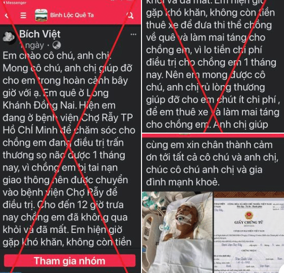 Tài khoản Facebook B.V kêu gọi giúp đỡ để có tiền đưa xác chồng về quê, BV Chợ Rẫy khẳng định bệnh nhân này không nằm điều trị tại đây.
