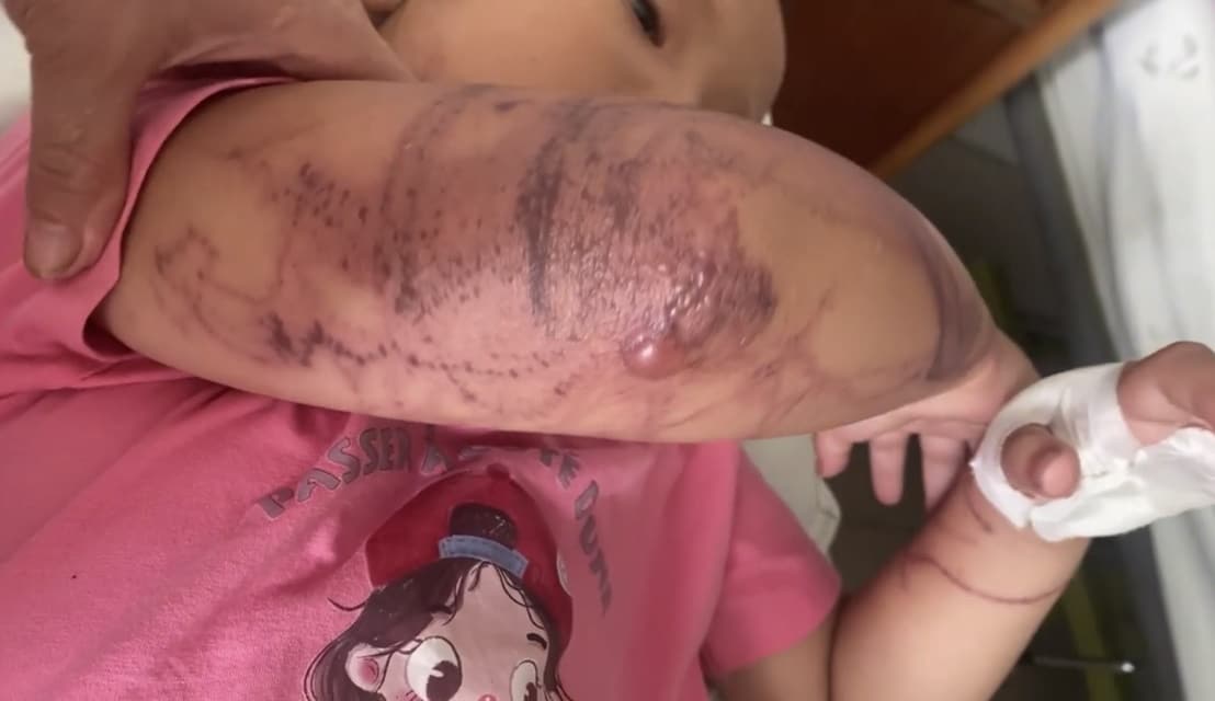 Khi người cha phát hiện đưa lên bờ, 2 cánh tay của bé đã bầm đen, chi chít vết đốt. Bé ngất lịm.