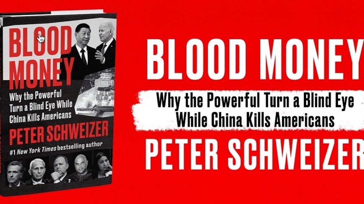 Một cuốn sách mới về Trung Quốc của tác giả Peter Schweizer có tựa đề "Tiền máu", đang được quảng cáo tại Quảng trường Thời đại Mỹ.