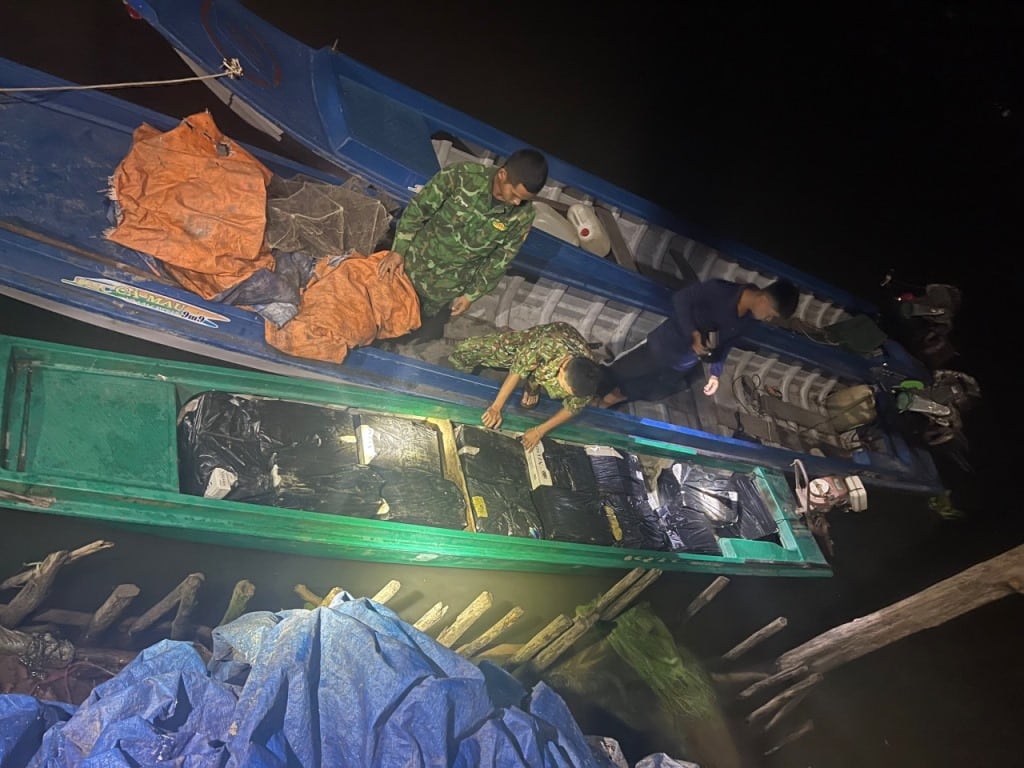 Bị phát hiện, nghi can nhảy xuống sông Hậu bơi về bờ Campuchia lẩn trốn. Kiểm tra vỏ lãi, bộ đội biên phòng thấy 3.420 bao thuốc lá ngoại.