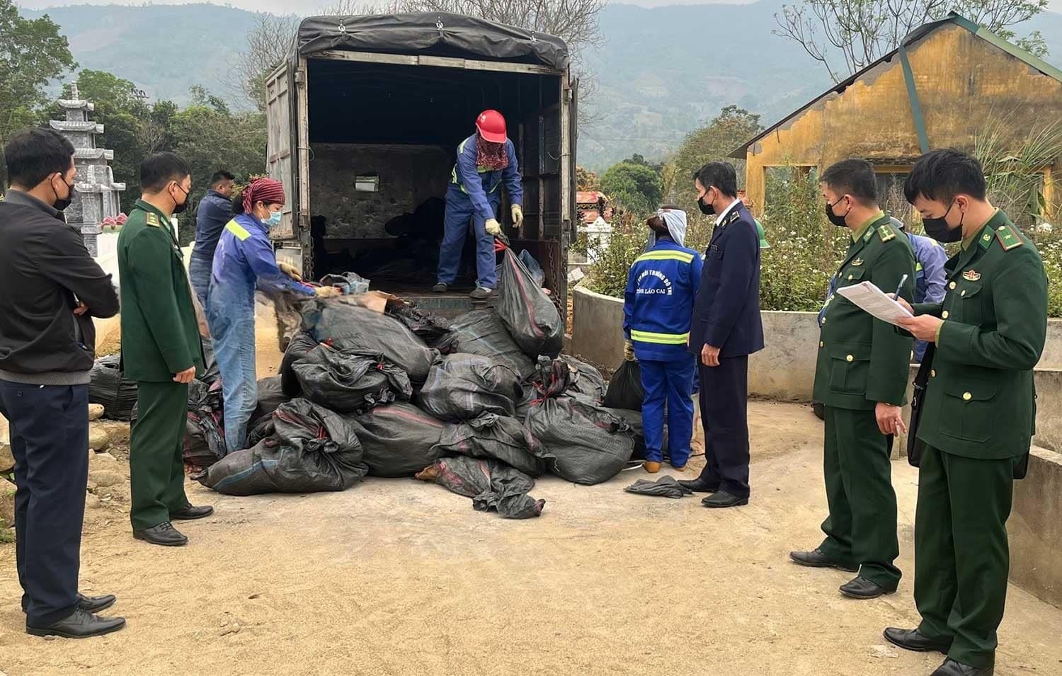 83 bao tải màu đen chứa hơn 1,5 tấn tai lợn không rõ nguồn gốc, bốc mùi hôi thối đã bị cơ quan chức năng phát hiện ở khu vực gần biên giới.