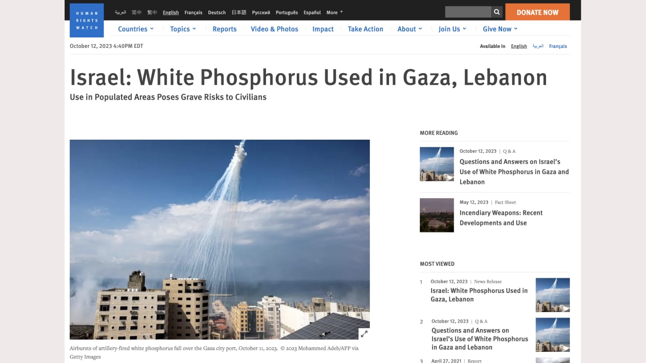 Tổ chức Theo dõi Nhân quyền xác thực quân đội Israel sử dụng phốt pho trắng tại Gaza