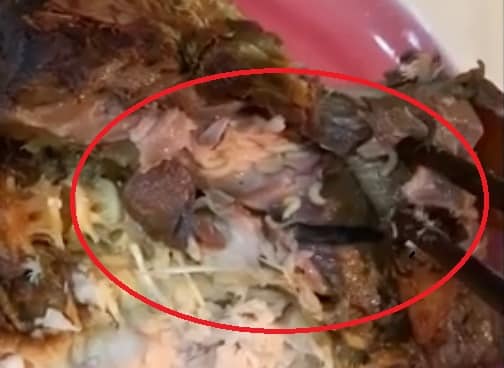 Rất nhiều dòi trong miếng cá kho mua tại cửa hàng thực phẩm sạch CleverFood (Thanh Xuân, Hà Nội), ngày 2/4.