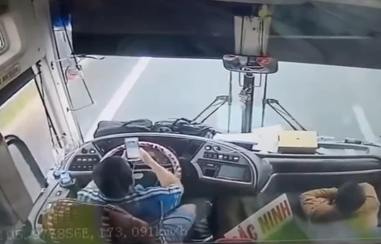 Tài xế xe giường nằm lái xe bằng khuỷu tay, mắt nhìn điện thoại