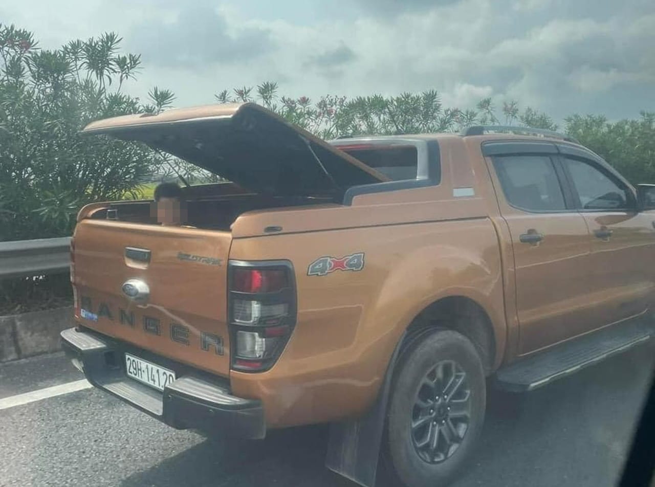 Người đàn ông cho bé trai ngồi thùng xe bán tải, chạy trên cao tốc