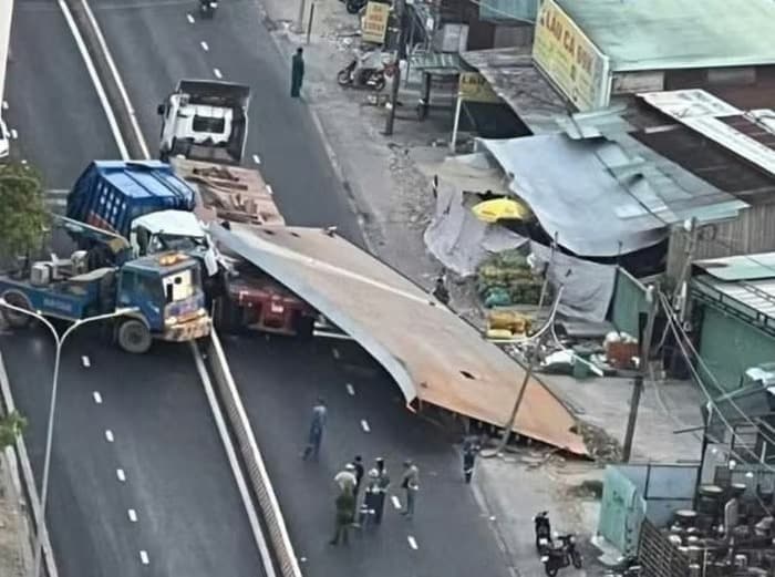 Sau va chạm với xe đầu kéo, tấm thép rơi xuống đè biến dạng cabin xe rác khiến tài xế xe rác tử vong.