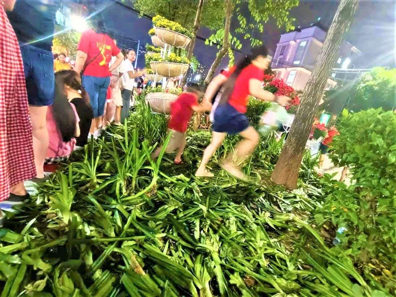 Buổi tổng hợp luyện diễu binh lần 2 tại Hà Nội để lại cây, hoa bị giẫm nát và rác thải trên nhiều tuyến đường, công nhân gấp rút trồng lại.
