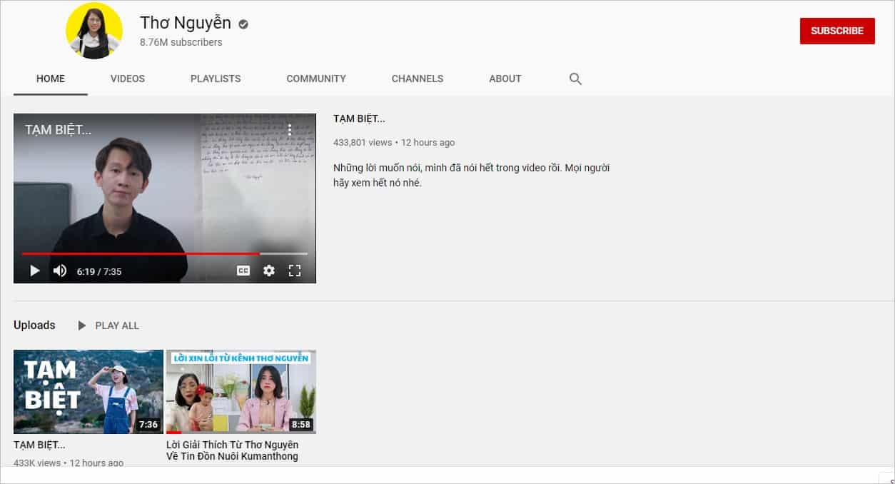 Ekip kênh YouTube Thơ Nguyễn thông báo ẩn toàn bộ video, tắt chức năng kiếm tiền và xin lỗi vì sự khác biệt về quan điểm.