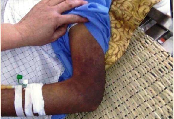 Ông Nguyễn Văn N. (Hưng Nguyên, Nghệ An) bị con trai hành hung tới mẻ bánh chè, mẻ xương ống chân, gãy 1 xương sườn, người bầm tím.