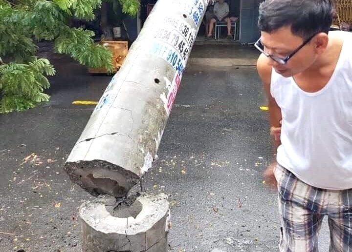 Trong mưa gió lớn, một cột điện trên phố Tôn Đản (TP Đà Nẵng) bị gãy ngang thân, gây băn khoăn khi trong thân cột điện không có lõi sắt.