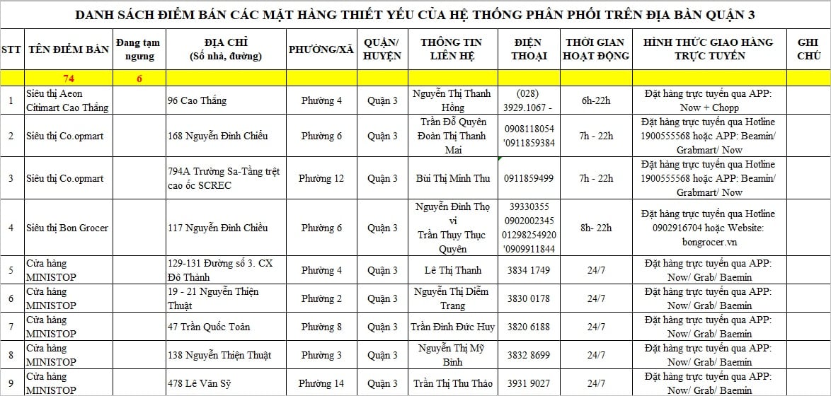 2.833 điểm bán thực phẩm, hàng thiết yếu, kèm thông tin liên lạc và cách thức đặt hàng trên toàn thành phố được Sở Công thương cập nhật.