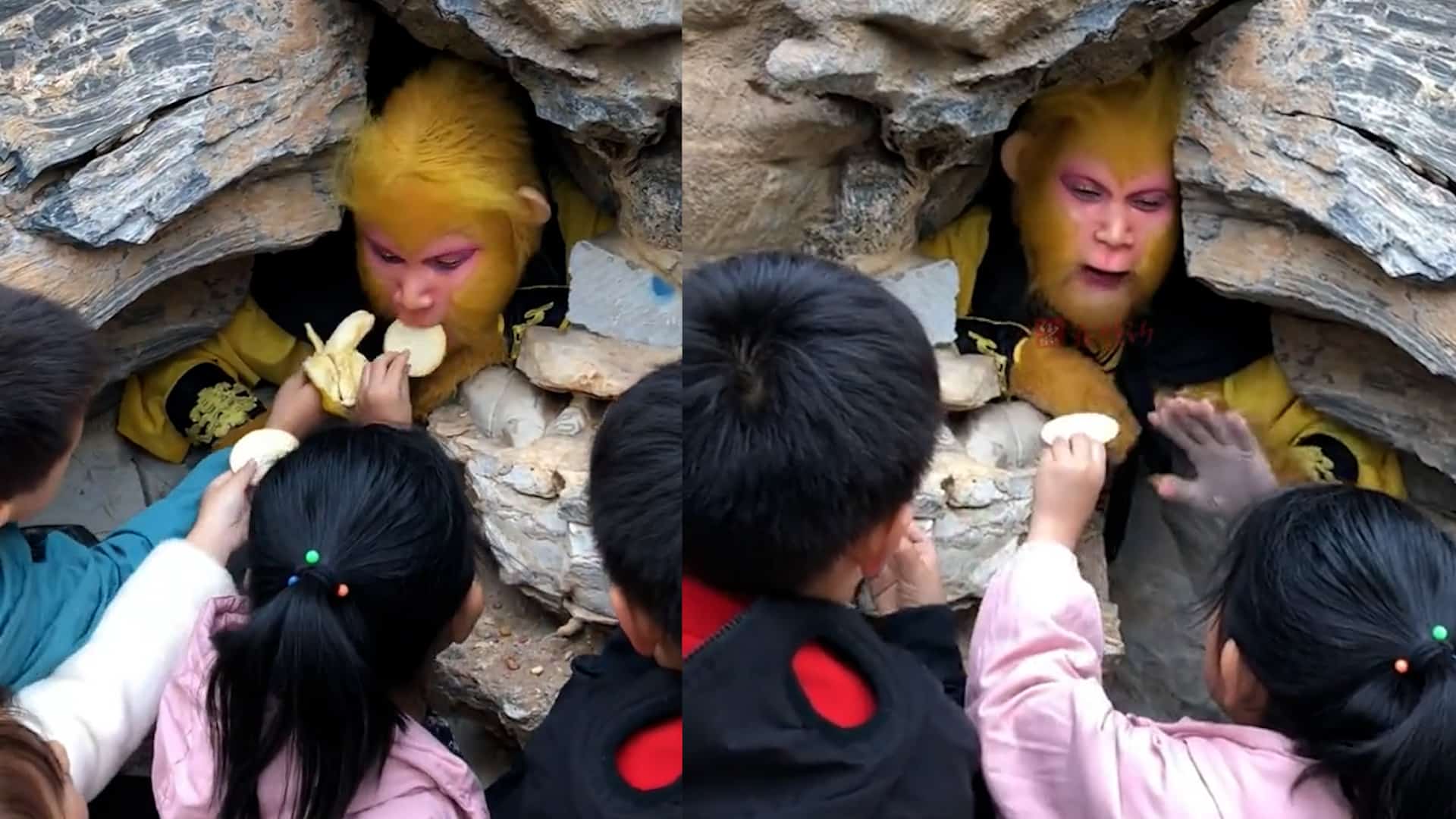 [VIDEO] Đóng vai Tôn Ngộ Không, nam nhân viên phải xin các em nhỏ ngừng đút đồ ăn