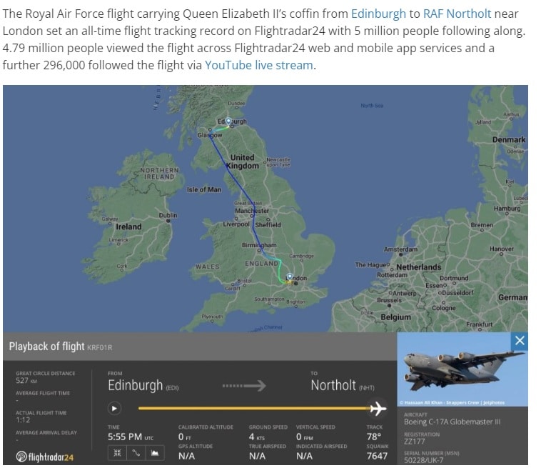 Theo hãng tin Reuters, chuyến bay chở linh cữu nữ hoàng Elizabeth II từ Edinburgh đến London đã trở thành chuyến bay được theo dõi nhiều nhất trong lịch sử.