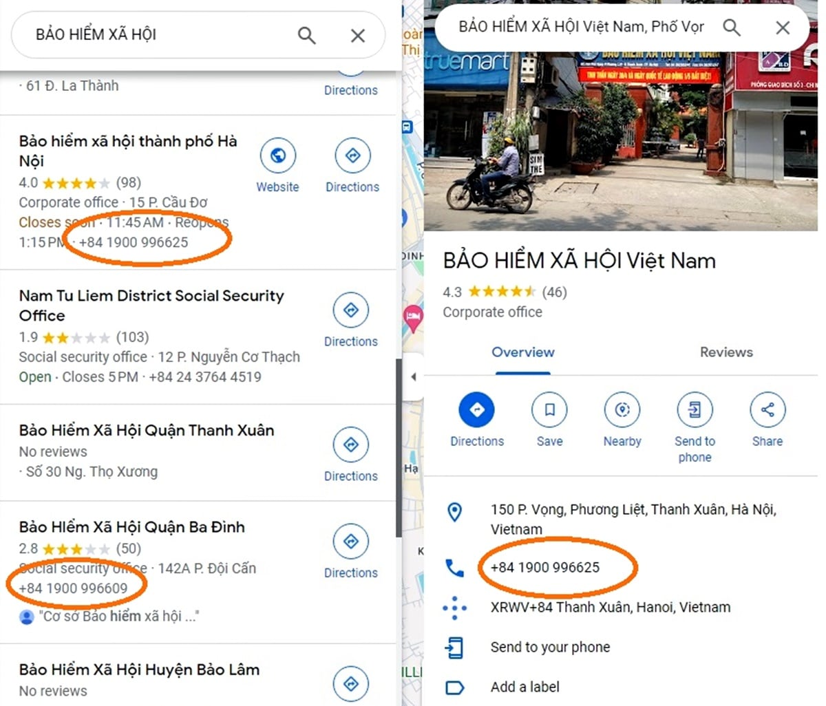 Bảo hiểm xã hội Việt Nam cho hay trên Google Maps, số tổng đài của các cơ quan bảo hiểm xã hội đều bị chỉnh sửa thành 1900.9966.xx, không chỉ thu tiền cước điện thoại…