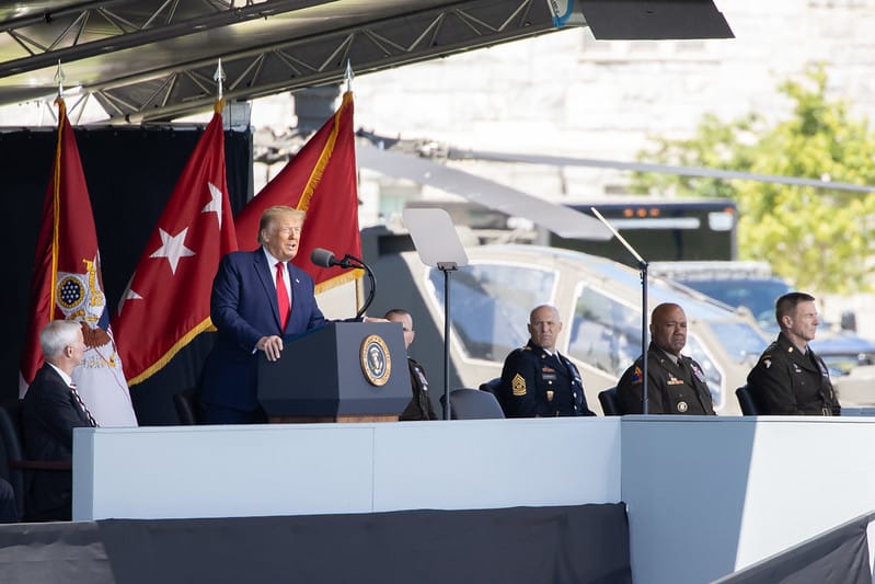 TT Trump hôm 13/6 đã có bài phát biểu dài tôn vinh quân đội Mỹ và ca ngợi những giá trị nền tảng trường tồn của nước Mỹ: gia đình, Chúa, công lý và tự…