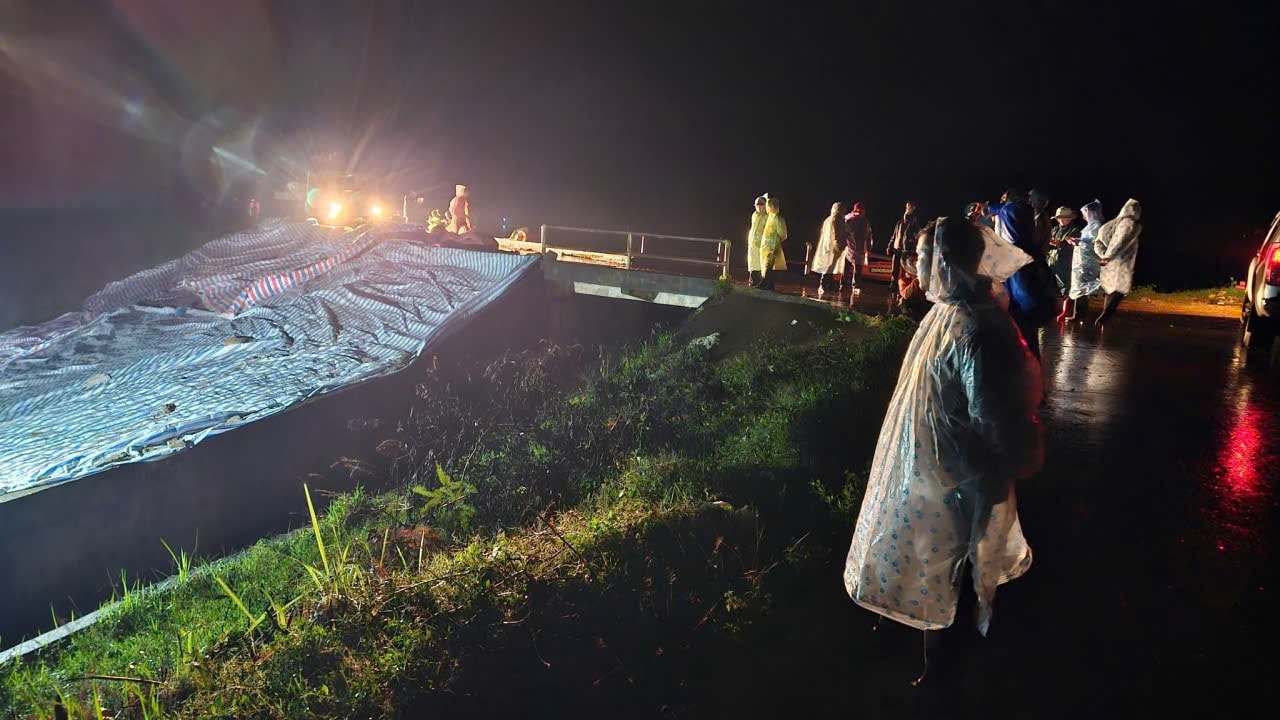 Hồ thủy lợi Cay An dung tích 1,7 triệu m³ có vết nứt sâu rộng, thấm nước. Lực lượng chức năng phủ bạt gia cố và sơ tán dân đến nơi an toàn.
