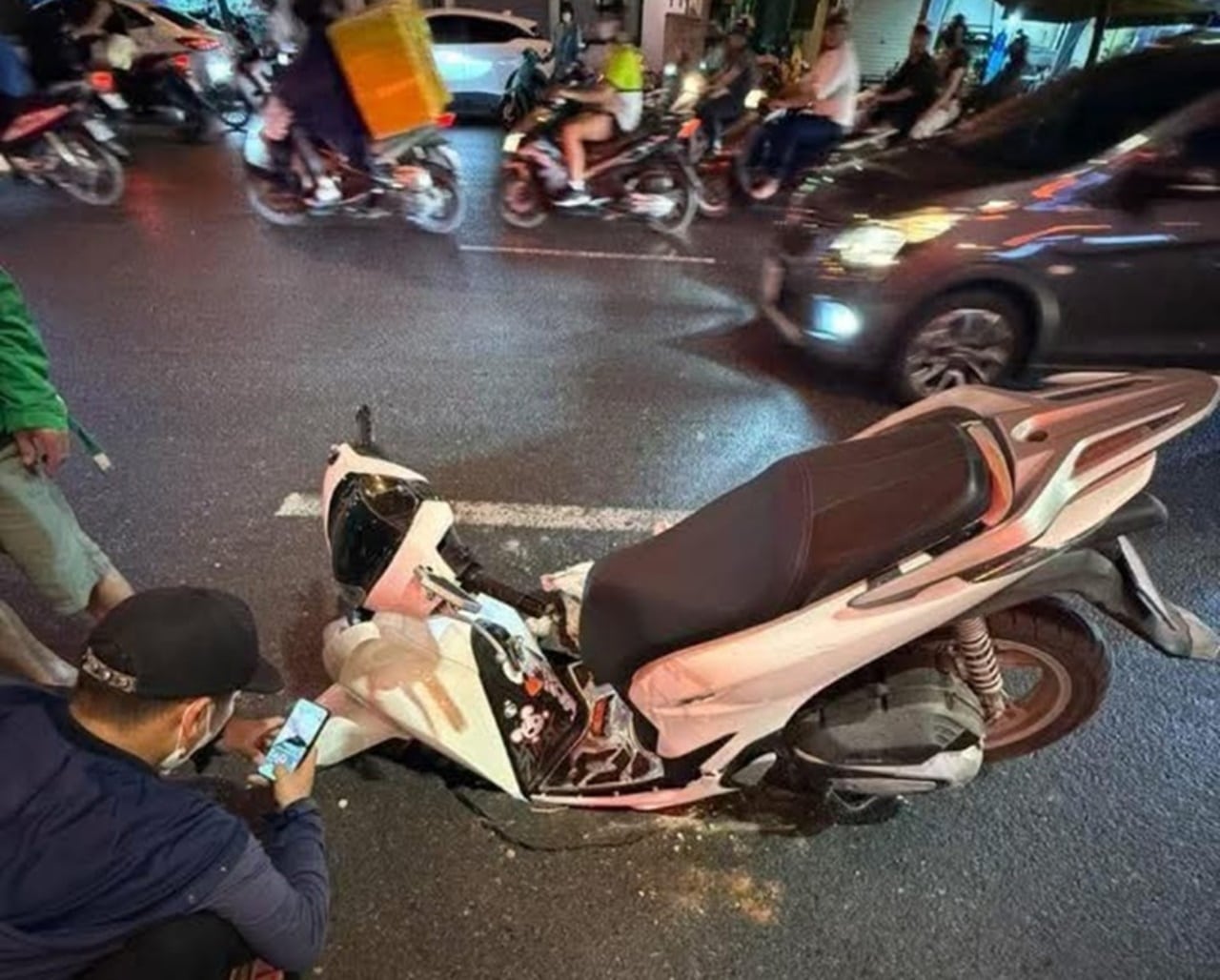Đang đi trên đường Trường Chinh (quận Hoàng Mai, TP. Hà Nội), chiếc xe máy Honda SH bất ngờ cắm thẳng xuống mặt đường, bánh trước mất hút.