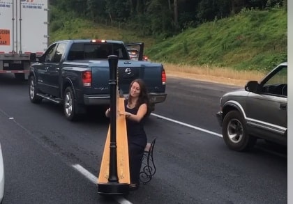 Vụ tai nạn khiến đoạn đường dài phía trước bị tắc nghẽn, nghệ sĩ hạc cầm Hailey Ann Smith đã chơi đàn để phục vụ cộng đồng.