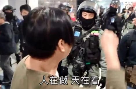 Khi cảnh sát Hồng Kông bắt bớ và đánh người dân, một người phụ nữ trung niên mặc áo màu cà phê đã lớn tiếng quát mắng cảnh sát lạm dụng bạo lực.