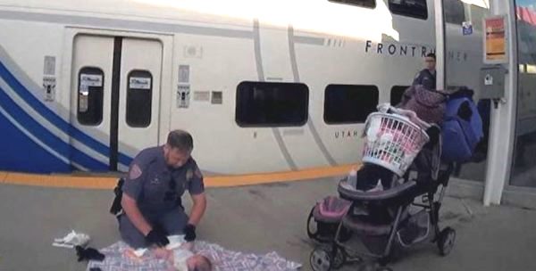 Cảnh sát quỳ gối thay tã cho con của người phụ nữ bị rối loạn tâm lý