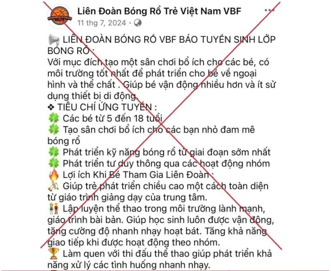 Thời gian qua, trên mạng xã hội Facebook xuất hiện các tài khoản giả mạo “Liên đoàn bóng rổ Việt Nam VBF” thông báo tuyển sinh các lớp bóng rổ nhằm lôi kéo người dân…