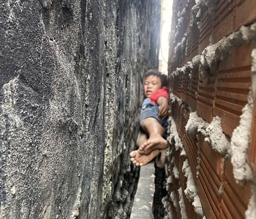 Cứu bé trai mắc kẹt ngang chừng trong khe tường hẹp