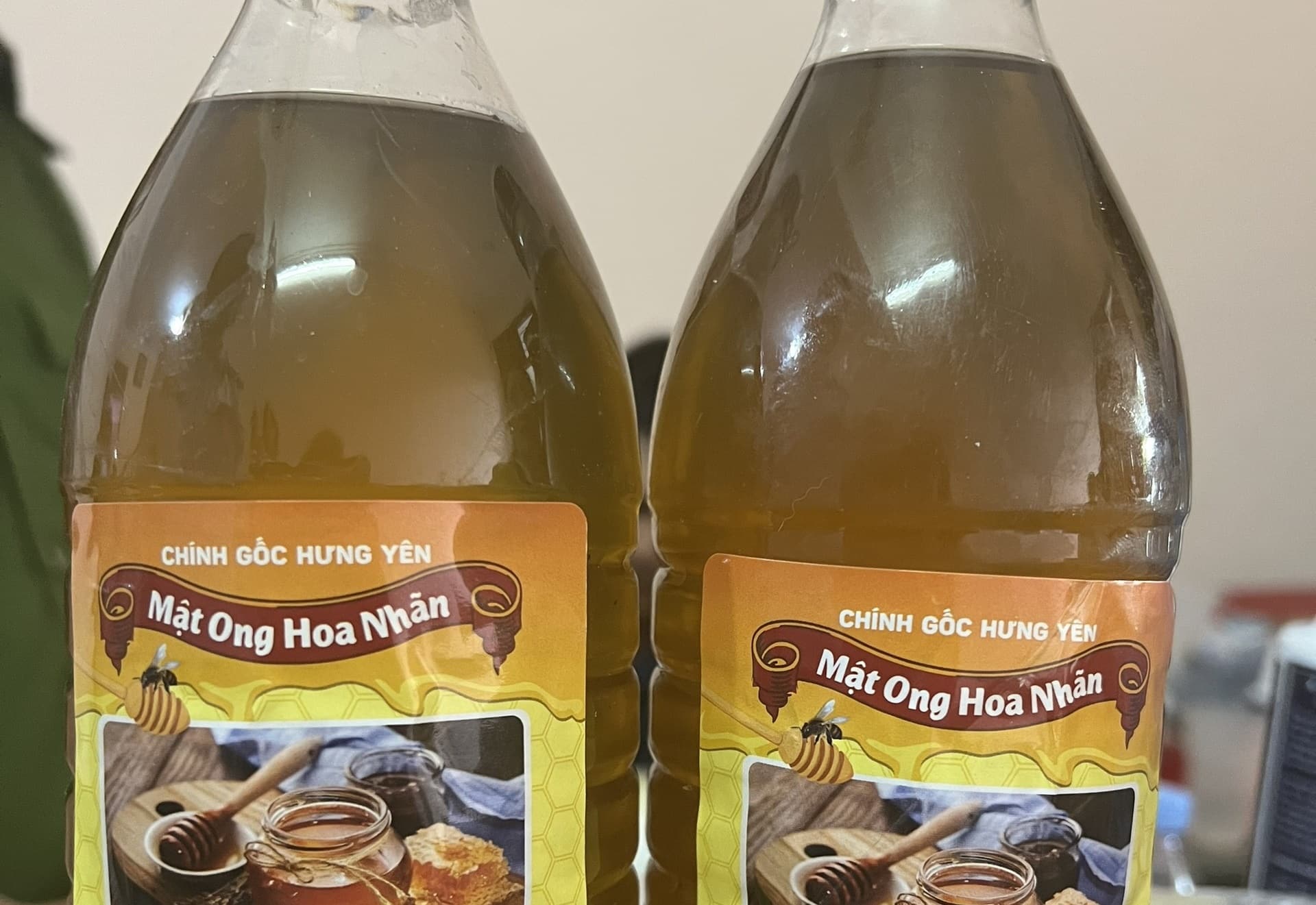 Hơn 2.000 lít mật ong giả nhãn hiệu "Mật ong hoa nhãn - chính gốc Hưng Yên" làm từ đường, nha, nước cốt mạch bị thu giữ tại Hoài Đức, Hà Nội.