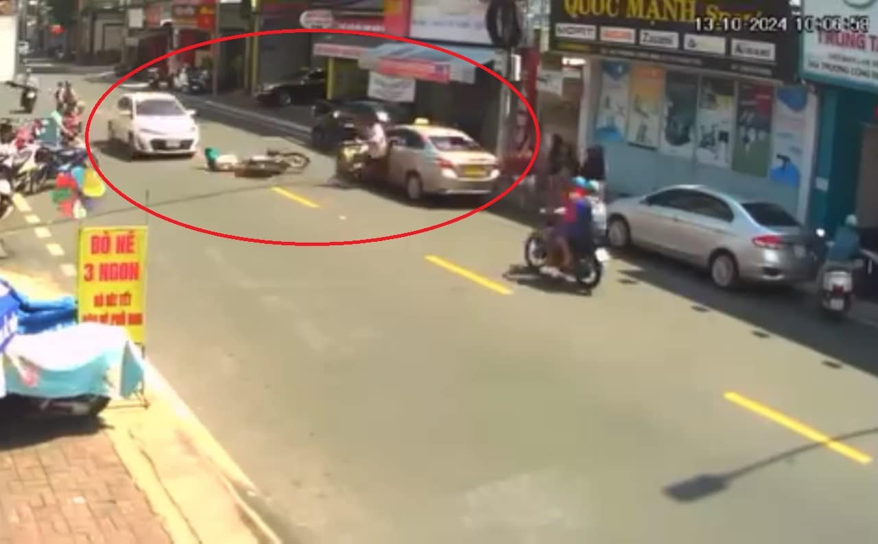 Đang trả khách bên đường, tài xế taxi bất ngờ mở cửa không quan sát, khiến một phụ nữ 48 tuổi đi xe máy ngã văng xuống đường.