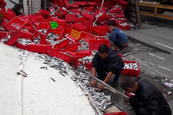Thị trấn Nghèn-Hà Tĩnh: Người dân gom hơn 2 tấn cá giúp tài xế xe tải bị lật