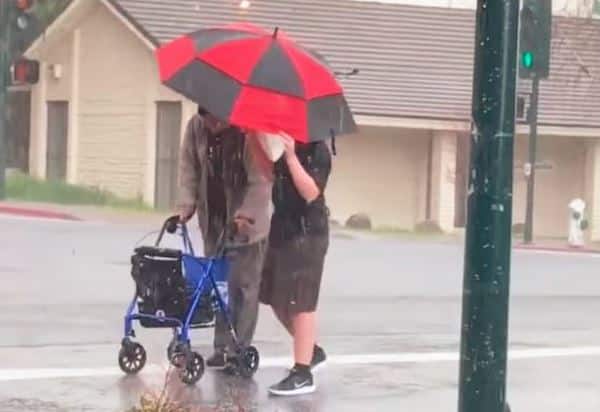 Xúc động cậu bé lao ra ngoài trời mưa đá che ô cho cụ già