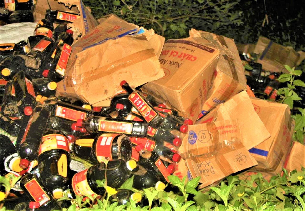Hơn 1.000 chai nước mắm và nước chấm, phần lớn đã hết hạn sử dụng, bị vứt bỏ trong bụi rậm tại xã Tam Thái, huyện Phú Ninh.