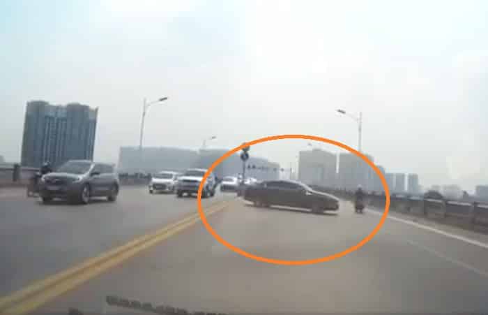 Nữ tài xế điều khiển chiếc xe ôtô hiệu Peugeot quay đầu xe trên cầu Vĩnh Tuy, khiến 4 xe ôtô đi phía sau va chạm liên hoàn.