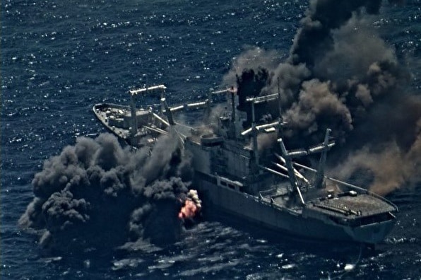 Con tàu mục tiêu này đã bị trúng ít nhất 3 tên lửa và bốc ra nhiều khói...