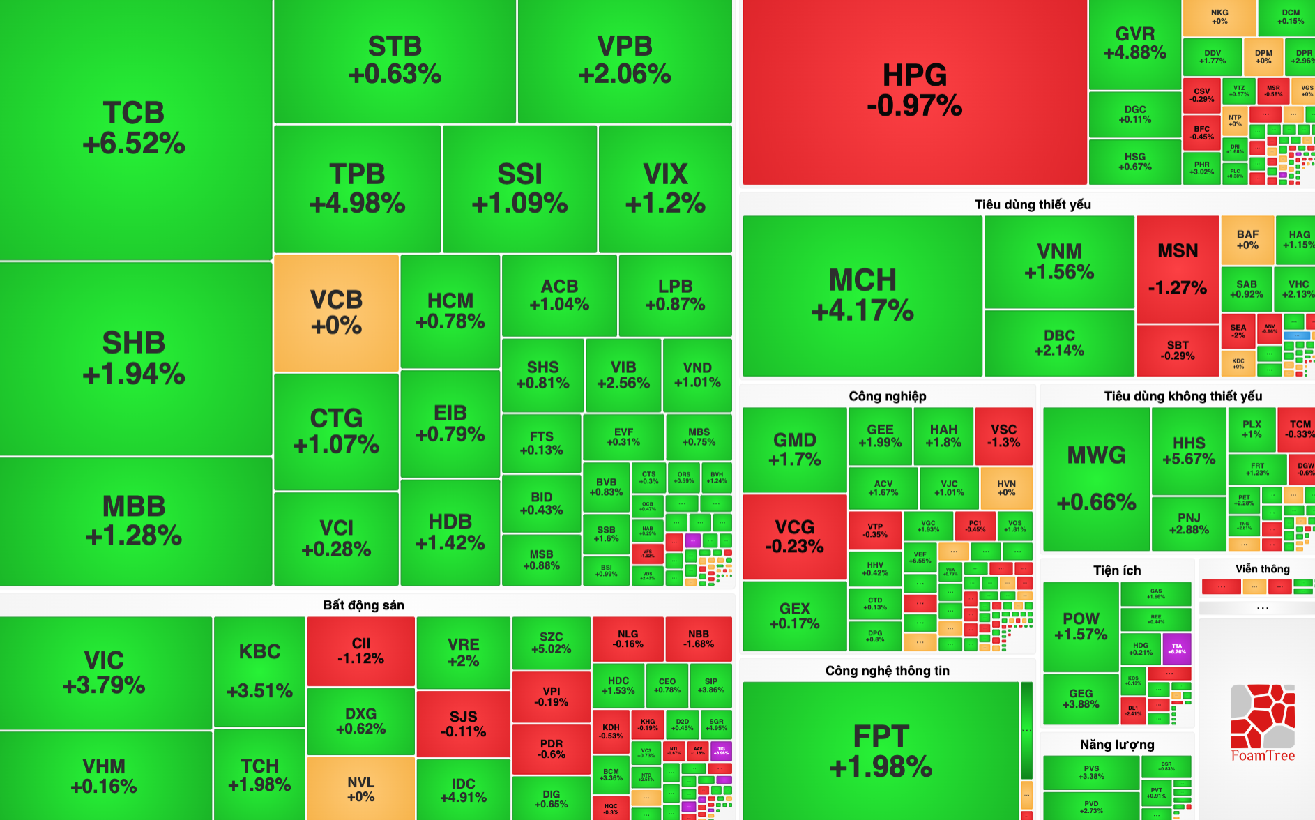Độ rộng toàn thị trường nghiêng về sắc xanh với 502 mã tăng, 31 mã tăng trần, 810 mã đứng giá, 260 mã giảm, 8 mã giảm sàn.