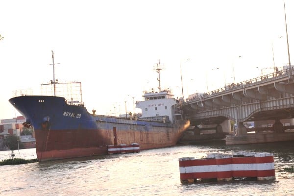 Tàu hàng mang số hiệu Royal 09 bất ngờ gặp sự cố bị hỏng máy, trôi tự do rồi đâm vào thành cầu Đồng Nai.