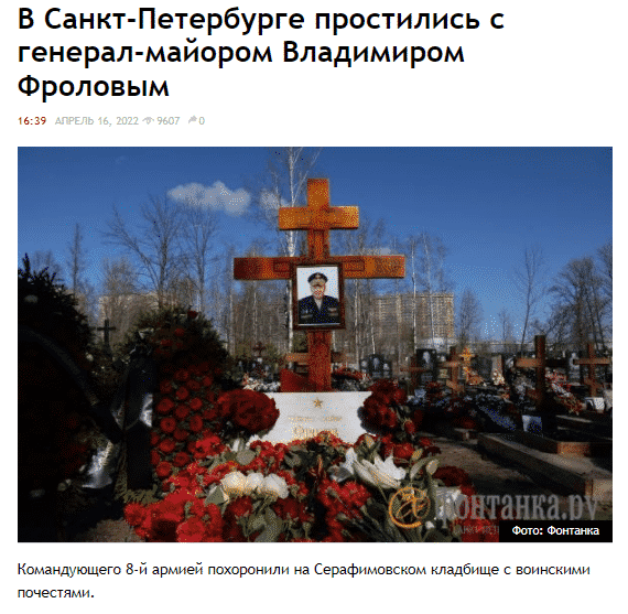 Thiếu tướng Petrovich Frolov, phó chỉ huy trưởng của đơn vị Lục quân thứ 8 đã được an táng tại nghĩa trang Serafimovskoye, St. Petersburg.