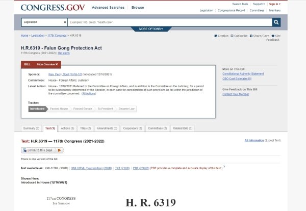 Mới đây, trang web chính thức của Quốc hội Hoa Kỳ, đã công bố thông tin về quá trình xem xét lại "Dự luật Bảo vệ Pháp Luân Công" H.R.6319.
