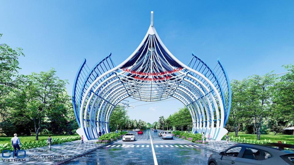 Cổng chào khu Trung tâm du lịch Cát Bà có chiều rộng khoảng 25m, chiều dài 26m và chiều cao 18m.