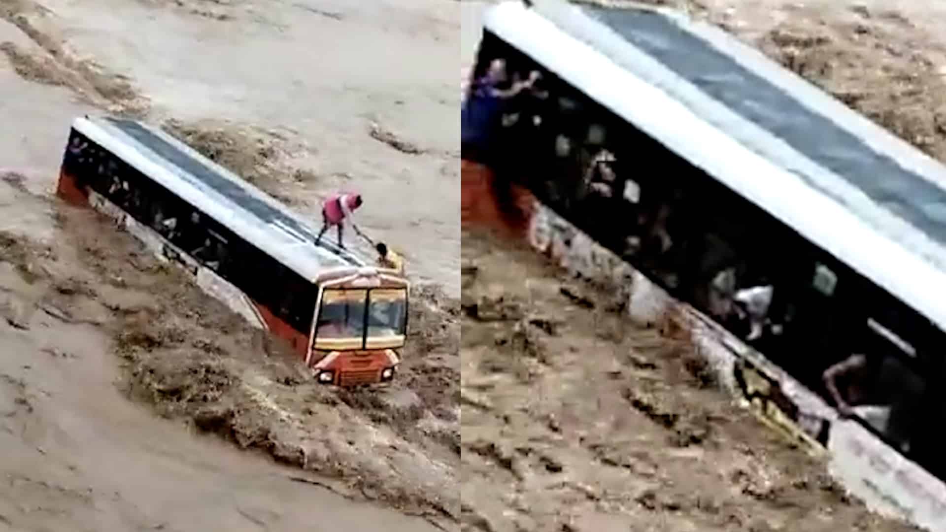 Mưa lớn đã khiến mực nước sông dâng cao, khiến chiếc xe buýt đi đến giữa sông thì không thể di chuyển tiếp và bị mắc kẹt giữa dòng nước dữ dội