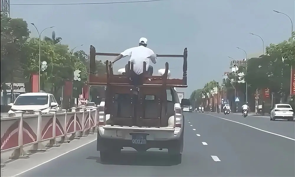 Xe bán tải biển xanh chở người ngồi ngất ngưởng trên chồng bàn ghế