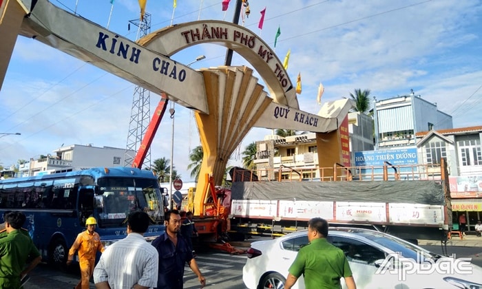 Xe tải tông nghiêng cổng chào TP. Mỹ Tho: Thiệt hại hơn 1 tỷ đồng