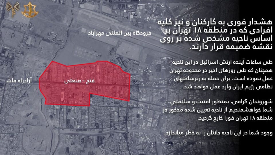 Israel đã phát đi cảnh báo người dân sống tại một quận của thủ đô Tehran, Iran sơ tán.