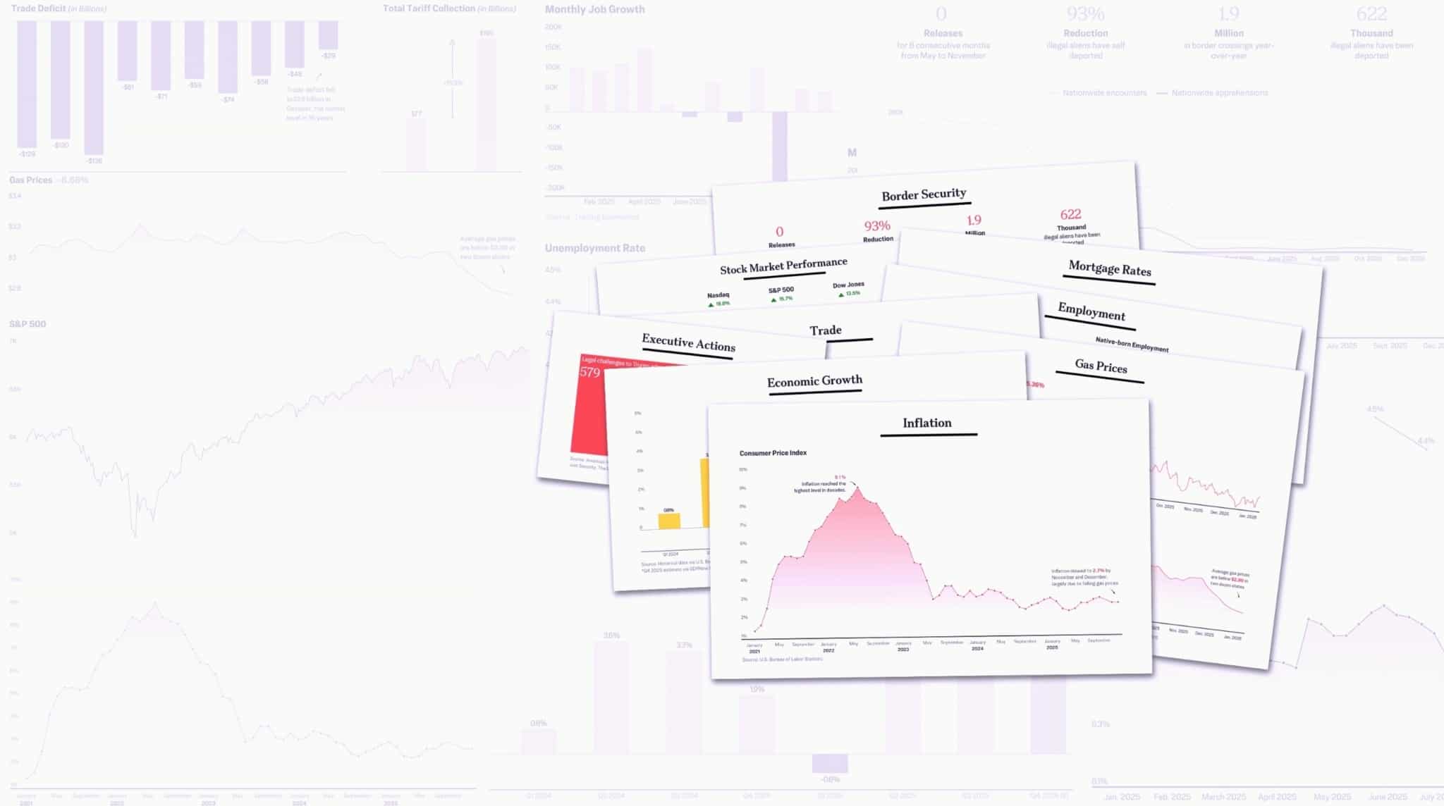 Trong một năm qua kể từ khi Tổng thống Trump trở lại Nhà Trắng, ông đã đạt được những thành tích nổi bật trong 9 lĩnh vực, bao gồm: thúc đẩy thị trường chứng khoán, tăng trưởng kinh tế, kiềm chế lạm phát, mở rộng thương mại, tạo thêm việc làm, giảm giá xăng dầu, kéo lãi suất thế chấp xuống thấp hơn, tăng cường an ninh biên giới và nâng cao hiệu quả hành động của chính quyền.