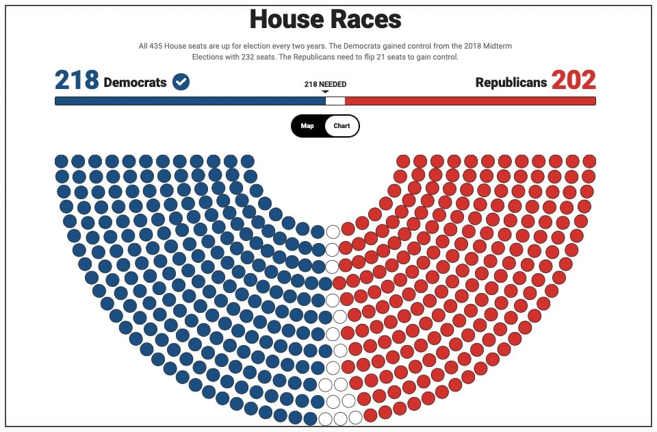 AP dự đoán đảng Dân chủ chỉ có thể giành thêm vài ghế nữa trong Hạ viện khi quá trình kiểm phiếu hoàn tất. Trước bầu cử, đảng Dân chủ nắm 232 ghế, đảng Cộng hòa chiếm 197 ghế (ngoài ra còn có 1 ghế độc lập và 5 ghế mở).