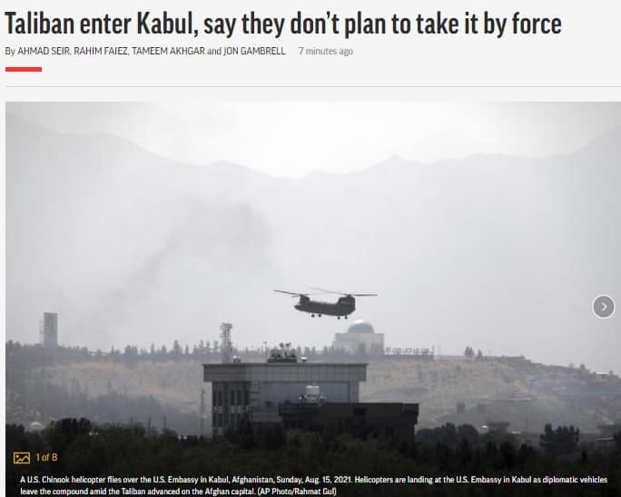 Các chiến binh lực lượng Hồi giáo Taliban đã tiến vào các khu vực ngoại ô thủ đô Kabul, Afghanistan. Các máy bay trực thăng đã xuất hiện bên trên tòa Đại sứ quán Mỹ để sơ tán nhân viên ngoại giao.