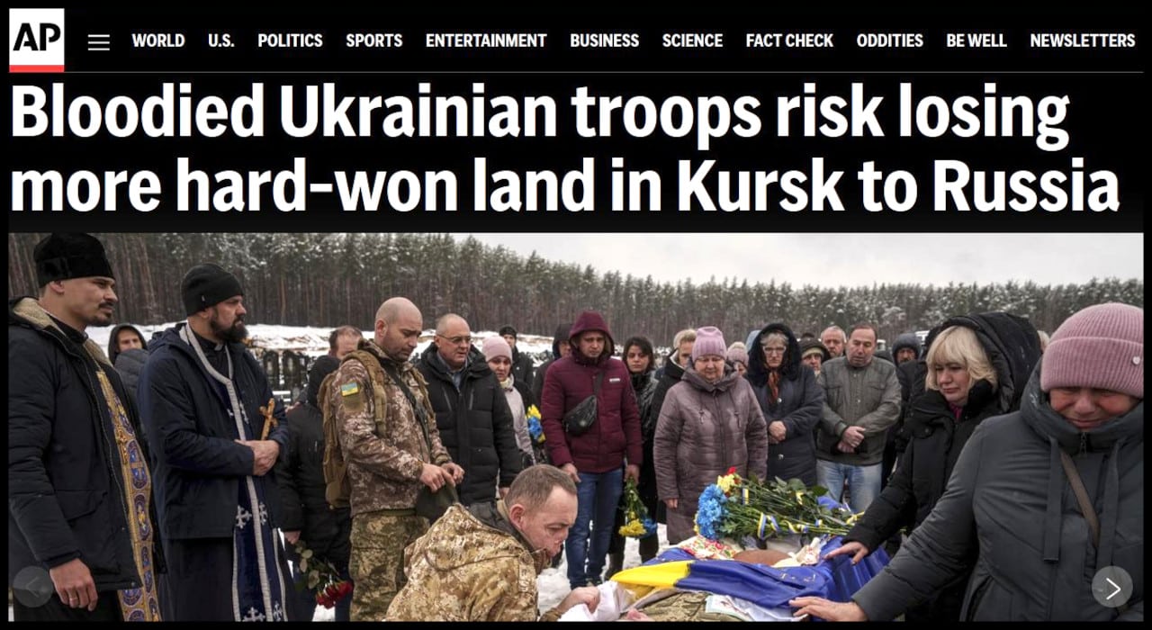 Sau 5 tháng trời tốn kém bao nhiêu tiền bạc súng đạn và xương máu để đánh chiếm được một phần lãnh thổ miền quê gần biên giới thuộc tỉnh Kursk của Nga, thì nay quân đội thương tàn về thân thể (bloodied) và sa sút về tinh thần (demoralized) khi đối mặt với nguy cơ bại trận, tiếp tục trả đất dần dần về tay người chủ ban đầu Liên bang Nga, theo AP báo cáo hôm Thứ Bảy. Trong khi đó, nội bộ giới chức Kiev không thống nhất, khi một số người muốn tiếp tục giữ phần lãnh địa đó bằng mọi giá, trong khi một số người khác cho rằng thậm chí từ đầu lẽ ra không nên tiến hành chiến dịch Kursk này.